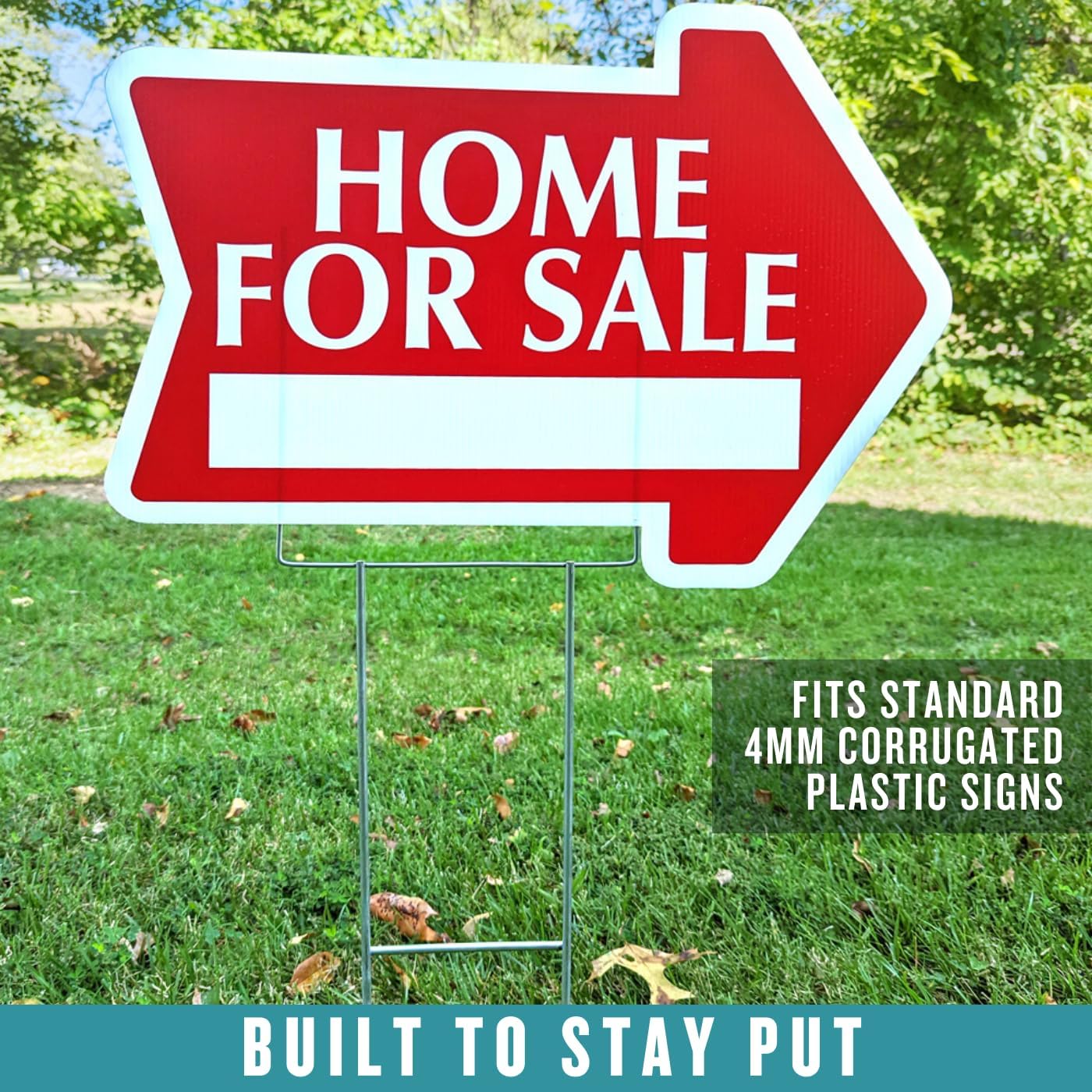 Display your yard signs with confidence using these 10" x 30" Heavy Duty Metal Step Stakes. Designed to fit most corrugated plastic yard signs, these H-frame stakes help keep your signs upright, visible, and secure. The sturdy base is made from extra-thick 1/4" diameter galvanized steel wire, which is twice the thickness of many standard yard sign stakes. This heavy duty construction provides dependable strength and helps your sign stay firmly in place. The 9-gauge galvanized steel U-top slides easily into corrugated plastic signs while helping hold them securely. Installation is simple and requires no tools. Slide the stake directly into the flutes of your corrugated plastic sign and press the frame into the ground using both hands on the top wire or by stepping on the bottom wire. These step stakes are ideal for real estate signs, political campaign signs, directional signage, event promotions, and other outdoor displays.