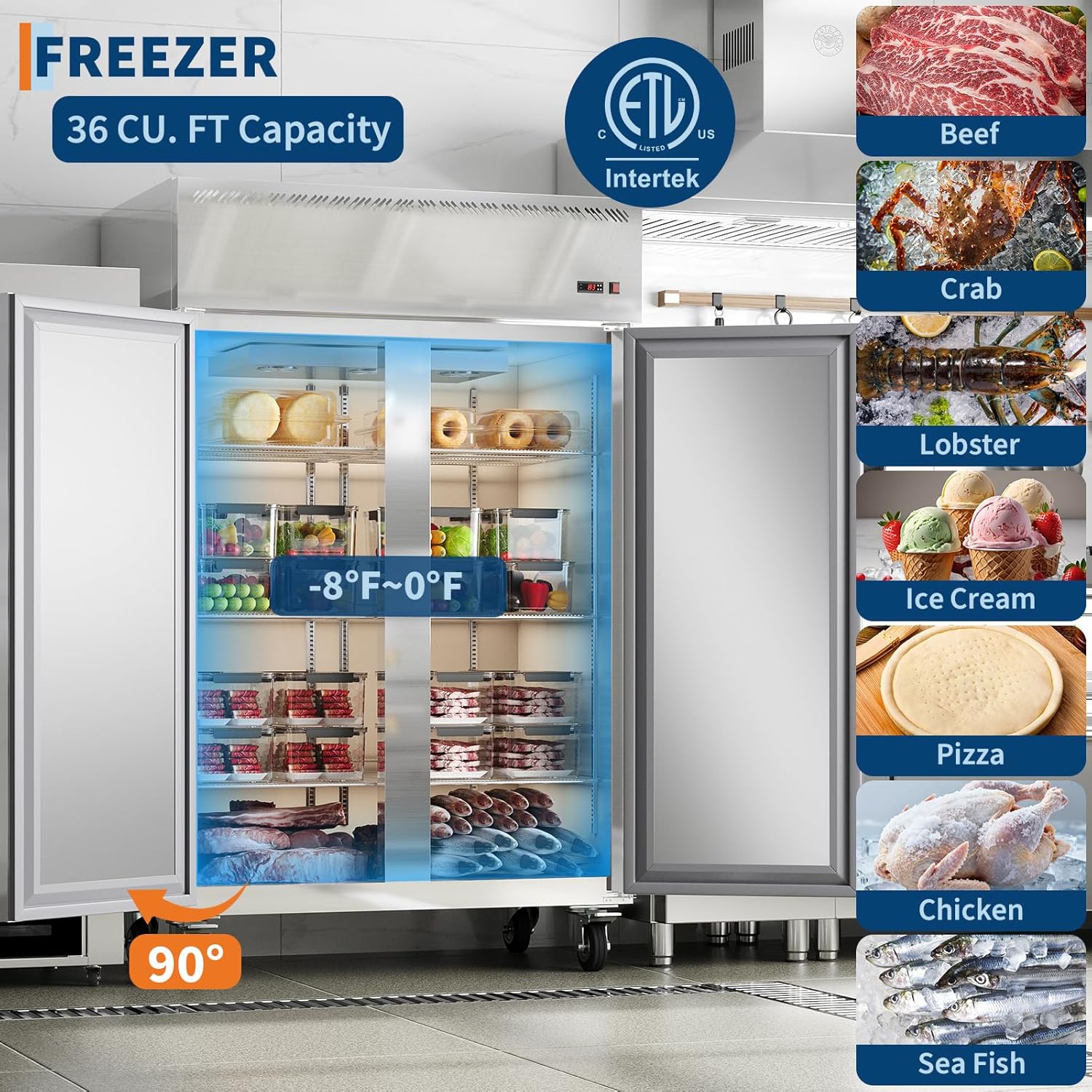 48" Commercial Freezer – Superior Stainless Steel, 2 Door, 36 Cu.Ft for Restaurants, Bars & ShopsUpgrade your food and beverage storage with this high-capacity 48-inch commercial freezer, designed for professional kitchens, restaurants, bars, and retail spaces. Constructed from heavy-duty stainless steel for lasting durability and a clean, modern look, this reach-in freezer offers outstanding performance and reliability for all your freezing needs.Generous 36 Cu.Ft Capacity: Spacious interior with two durable doors and six adjustable shelves for flexible storage of frozen foods, beverages, or ingredients.Powerful Fan Cooling System: Maintains a consistent temperature range from -8°F to 0°F (-22°C to -18°C), ensuring your products stay perfectly frozen.Easy Access & Organization: Two-section design with durable reach-in doors allows for effortless organization and quick access to contents.Automatic Defrost: Hassle-free auto defrost function reduces maintenance and keeps the freezer operating at peak efficiency.Bright LED Interior Lighting: Energy-saving LED lights illuminate the interior, making it easy to find products at any time.Versatile Application: Perfect for busy commercial environments such as restaurants, bars, cafés, bakeries, supermarkets, and convenience stores.Whether you’re running a bustling restaurant or managing a shop, this robust commercial freezer combines superior storage capacity with advanced cooling technology, making it a reliable choice for professionals who demand quality and efficiency.