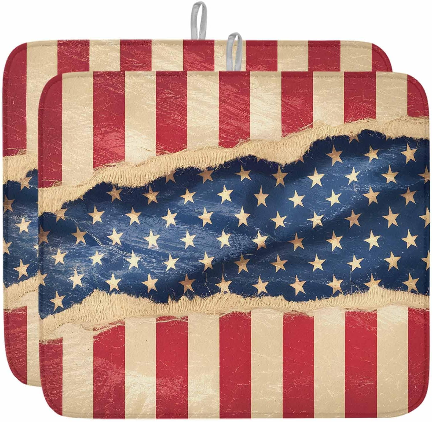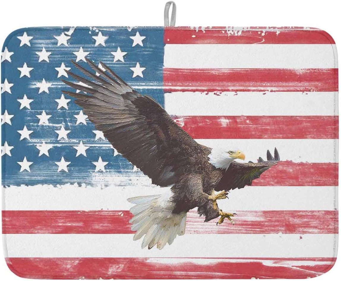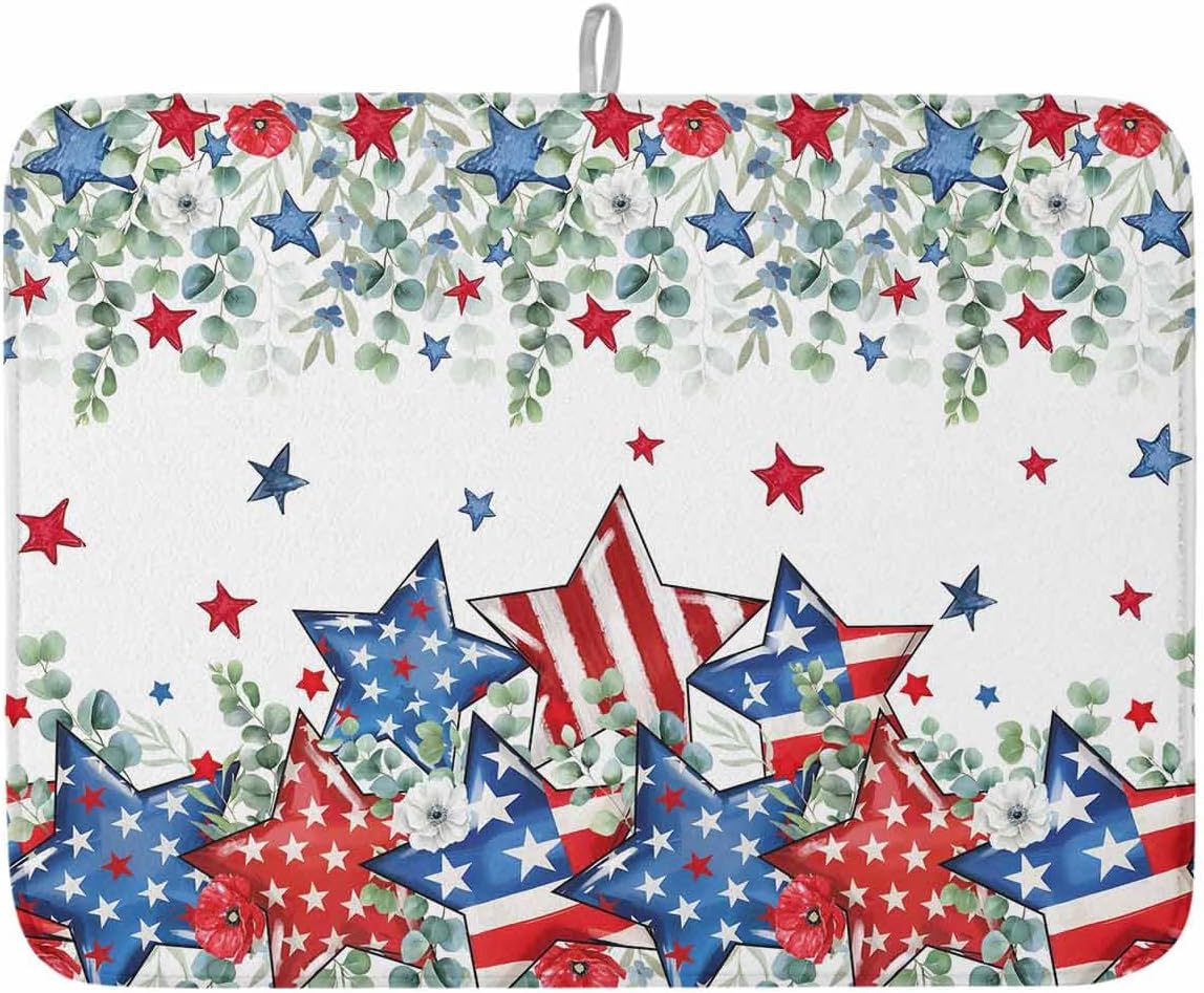 4th of July Independence Day dish drying mat for counter makes your kitchen more tidy and clean.Bringing you a sense of visual enjoyment a chic spring vibe and a warm holiday atmosphere, combining practicality and beauty.Size & Package16 x 18 Inch (Medium) / 18 x 24 Inch (Large).Fit most counters, protect your countertop tables from hot pans or appliances.Premium MaterialThe buffer design of the back prevents bowls, glassware and countertops from being scratched or damaged. The back has anti-slip design to prevent the mat slip.Ultra AbsorbencyThe surface of this dish drying mat is made of absorbent material, absorbs 4x its weight in water, and keeps your counter dry.Hanging Loop DesignThe lanyard design can be hung without occupying the space and can be stored and dried. The whole is soft and foldable for easy storage; neatly wrapped, and not easy to fall off.Widely UsedKitchen drying mat for kitchen counter countertop, coffee bar, dish drain rack, great for air drying dishes, glasses, silverware, pots, pans. The bar mats for coffee station is not only a coffee bar accessory but also can be used as dish drying mats, cutlery rack mats, pet feeding mats, door mats, bar mat and bathroom drying mat.Clean & CareMachine Washable. Throw it in the washing machine with cold water and mild detergent, use the dryer, or hang it up to dry.Warm TipsPlease allow a 1-2 cm error due to manual measurement.The colors of pictures and objects may be off due to differences in the monitor.
