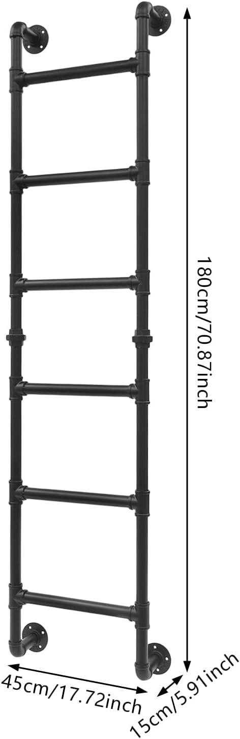 DetailsSmooth Edge: The rounded and smooth edges not only add to the aesthetics of the product but also improve the safety of use. Pre-Drilled Holes: They allow the ladder to be easily mounted on both walls, saving time and effort.SpecificationsMaterial: IronProcess: Baking Paint, GalvanizedStyle: ModernColor: BlackMount Type: Wall-mountedAssembly Required: YesMax. Load Capacity: About 150kg/330.69lbsLadder Steps: 6Gross Weight: 9kg/19.84 lbs Net Weight: 8.55kg/18.85 lbsProduct Size: 180*45*15cm/70.87*17.72*5.91inPackage Size: 95*48*12cm/37.4*18.9*4.72 inPackage Included1* 6-step LadderNotes1.Please carefully check if the size is suitable before placing an order.2.Please use the product within its weight capacity to avoid damage. 3.Please allow the slight color difference caused by the shooting light and a 1-3cm error due to manual measurement, and make sure you do not mind before you order.