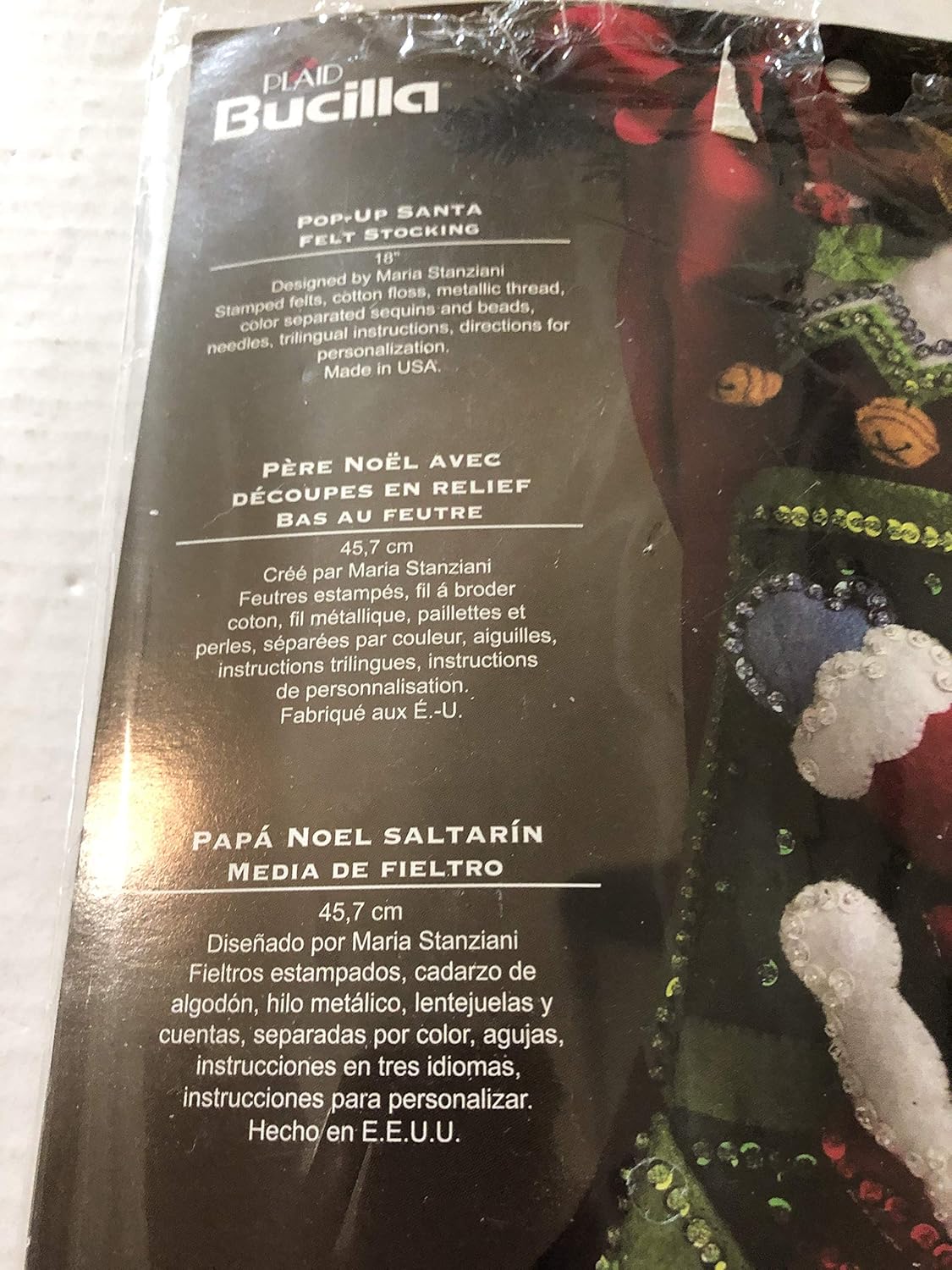 Festive designs, quality materials and generous embellishments continue to make Bucilla felt stockings a favorite stitchery tradition. For over a century, Bucilla has made it possible for stitchers to make beautiful holiday needle-crafts that area pleasure to create and a treasure for generations to enjoy. Features pop-up Santa design theme and each kit contains stamped felt, embroidery floss, sequins, beads, needles, and trilingual instructions. Measures 18-inch long. Made in the USA
