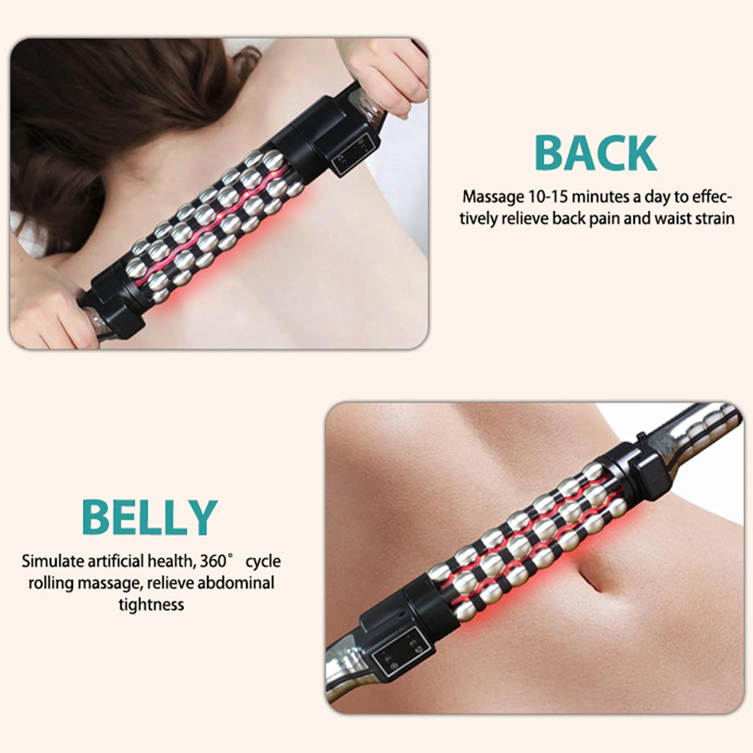 Applicable to:1. Eliminate shoulder and neck pain and relieve work pressure.2. Unlock the meridians and eliminate fatigue.3. Rotating hot compress on the abdomen for electric massage can help shape and open the abdominal meridians.4. Shape the legs and relieve muscle fatigue.Specifications:Material: ABS+stainless steelThermal energy: 35-55 ° CRated power: 36WRated voltage: 12V 5APower supply: plug-inInput voltage: 110-240V
