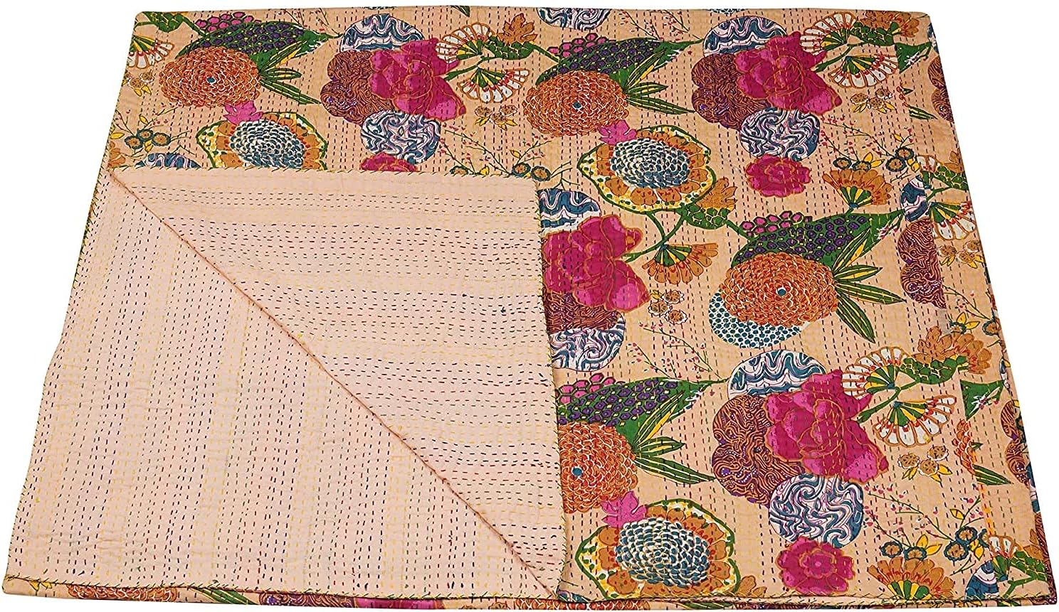 This Indian vintage kantha cotton quilt is completely hand stitched by Women artisan in Rajasthan, India. Kantha is a uniquely quilted texture made from layering colorful vintage. These quilts are famed and admired due to their Kantha work. Add classic style and elegance to your bedroom with a solid quilt set that comes in two patterns and an array of colors. They have different beautiful warm and charming colors, designs and patterns on either side which gives a distinct look. A beautiful creation to give your home a traditional yet authentic colorful. This mandala coverlet is reversible with contrasting vibrant patterns and colors. This kantha quilts can be used for bed covering to bedspread, blanket, bed-cover, quilt, throw. Quilts are made with quality fabric and are reversible which can be used from both sides.