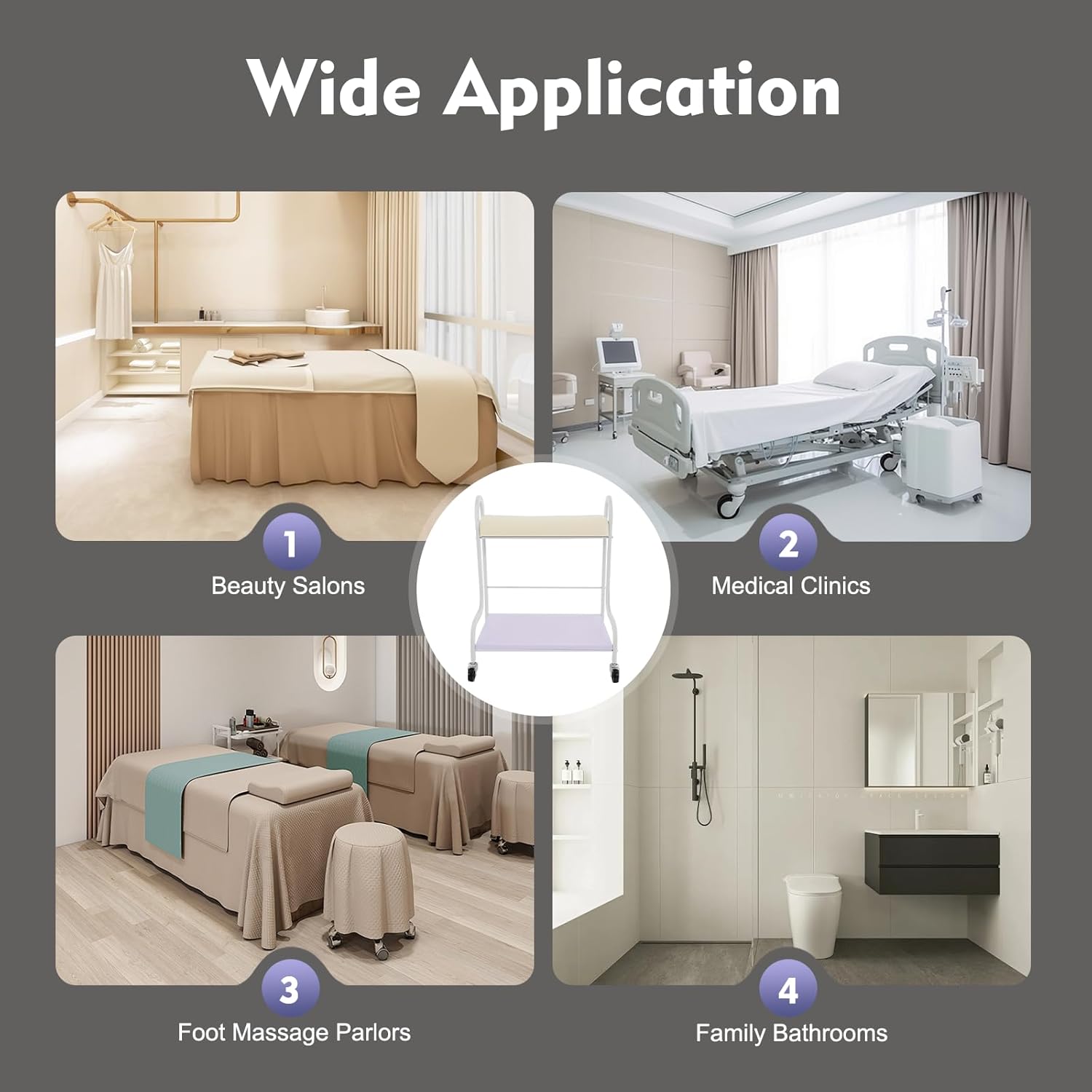 Description:Regular foot baths can help you relax your body and reduce stress. Our foot bath trolley is made of high-quality materials, sturdy and durable. The universal wheels on the bottom and handles on both sides help you to move items such as the footbath bucket with ease, and the footrest on the top can also be used for manicures and foot massages. This product makes it easy for you to enjoy a foot bath at home.Details:Arcs Shape Design: The rounded and smooth edges not only add to the aesthetics of the product but also improve the safety of use. Raised Bottom: It not only prevents the base plate of the trolley from touching the ground directly to prevent it from getting wet, but also makes it easy to sweep the bottom of the trolley.Application:This product can be used in beauty salons, medical clinics, hair salons, family bathrooms, and other places for foot baths, foot manicures, foot massages, and so on. Specification:Material: Metal, Wood, Sponge, PUColor: WhiteProcess: Baking PaintIndoor/Outdoor Usage: IndoorAssembly Required: YesMount Type: Floor Standing Caster Type: SwivelNumber of Wheels: 4Number of Tiers: 2Number of Items: 1Foot Pad Length: 50 cm/ 19.69 inShelf Size: 50*37 cm/ 19.69*14.57 inTier Spacing: 35cm/13.79in Maximum Load Capacity: About 100 kg/ 220.46 lbsGross Weight: 6 kg/ 13.23 lbs Net Weight: 5 kg/ 11.02 lbsPackage Size: 62*16*42 cm/ 24.41*6.3*16.54inProduct Size: 53*37*66 cm/ 20.87*14.57* inPackage Included:1* Foot Bath Trolley1* Foot Pad4* Universal WheelsAll Accessories for Installation