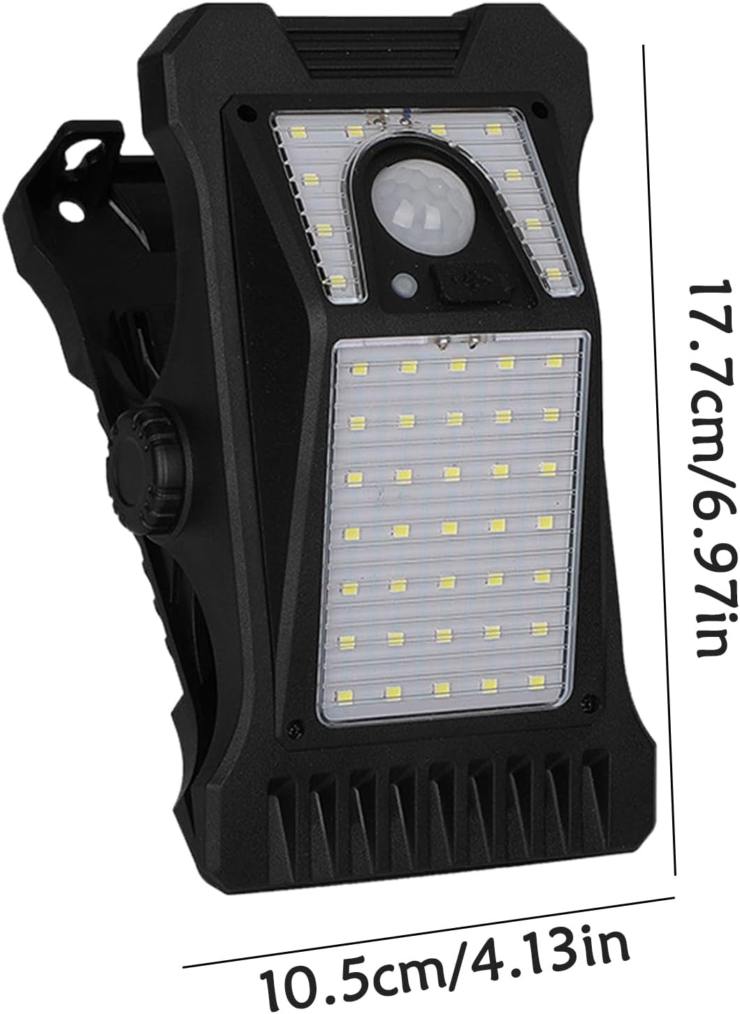 Product description Designed with energy-saving features, it has a gear 1 mode that automatically switches to high brightness when people are nearby and low brightness 30 seconds after they leave. Material: ABSProduct size: about 17.7x10.5cm/6.97x4.13 inchesBattery capacity: 1200mAhBattery life: 3-12h3 lighting modes: Gear 1: high brightness when people come, low brightness 30 seconds after people leave Gear 2: high brightness when people come, light off 30 seconds after people leave Gear 3: automatic low brightness at darkSensing distance: 3 metersPower supply: solar charging, USB chargingWaterproof Protection: IP65list:clip on solar lights outdoor*1 piececharging cable*1 piece Manufacturer Contact Information Refer to description