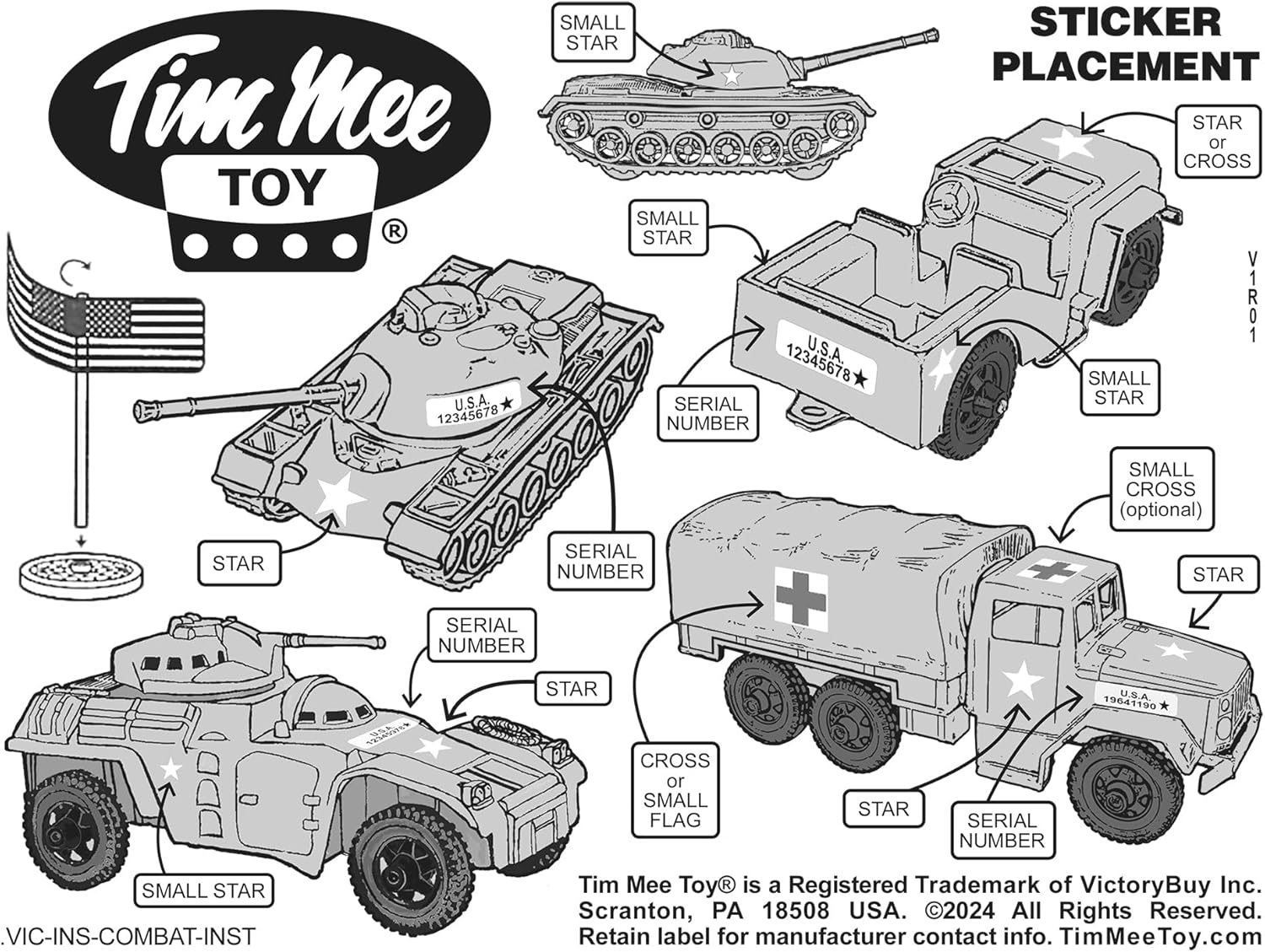 The Tim Mee Toy Combat Convoy OD-Green vs. Tan Playset is proudly manufactured in the United States and includes 64 pieces. Set includes evenly matched sides that include a M48 Patton Tank, Deuce-and-a-Half 2-1/2 Ton Cargo Truck, Modern Armored Car, Willys MB vehicles, flags, 3 M3 Artillery, and 24 Soldiers. Figures stand up to 2.1 inches tall and are approximately 1:35 scale. Soldiere are made from slightly flexible LDPE plastic with medium detail, and very little flashing.These vehicles and figures were originally offered by Processed Plastic Co. (Tim Mee Toy's parent company at the time). Includes sticker sheets with military and medical marking options. Playset is packaged in a plain brown corrugated box.These are real American Made toys, meant to be rolled around, knocked over, picked up and played with for years to come. Recommended for ages 5 and up.