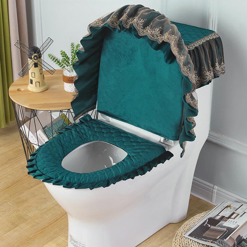 Toilet Lid Cover Set,3pcs/Set Lace Embroidery Pastoral Warm Soft Toilet Lid & Tank Covers Toilet Seat Cover Pads Toilet Seat Cushion Pads Zipper -Typ(Dark Green)(Dark Green)