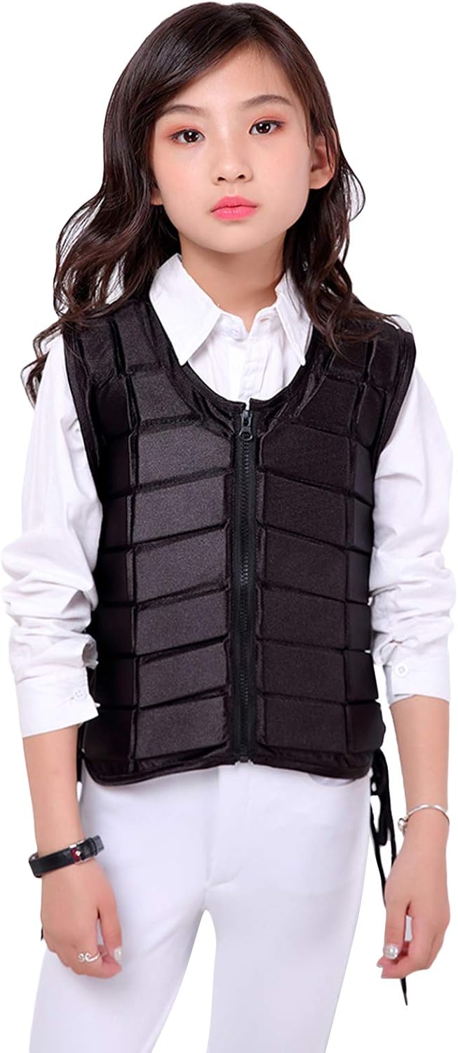 UNISTRENGH Equestrian Vest EVA Padded Horse Riding Vest Body Protector Protection Protective Zipper Waistcoat BlackMaterial: Polyester, EVA.Zipper: YKK brandColor: Black,Pink, Red, BlueFeature:1.breathable vest combines optimum comfort and fit while affording a high level of shock absorption and impact reduction.2. The zippered front and laced side adjustment provides an easier fit.3. Scalloped lower front allows less restriction.4. Extended padding provides increased protection for the tail bone.5. Professional horse riding equestrian body protector for unnisex.Dimensions:Small (CS): Bust: 25.59-29.53 inch (65-75 cm); back length: 16.14 inch (41 cm), for body height 35.43-43.3inch / 90-110cmMedium (CM): Bust: 27.56-31.5 inch (70-80 cm);back length: 17.32 inch (44 cm), for body height 43.5-51.18inch / 110-130cmLarge (CL): Bust: 29.13-33.07 (74-84 cm); back length: 18.5 inch (47 cm),for body height 51.28-59.05inch/ 130-150cmXLarge (Small): Bust: 31.5-35.43 inch (80-90 cm); back length: 20.87 inch (53 cm), for body height 59.15-62.99inch / 150-160cmMeasure Method:1.Measure the circumference of the widest part of the chest, the tape should be close to the body, but do not feel tight.2.If you have the conditions, please sit on the saddle, measure the shoulder from the back to the length of the saddle construction.3.Due to manual measurement, there may be an error of 1- 3cmPackage Included:1 x Equestrian Horse Riding Vest